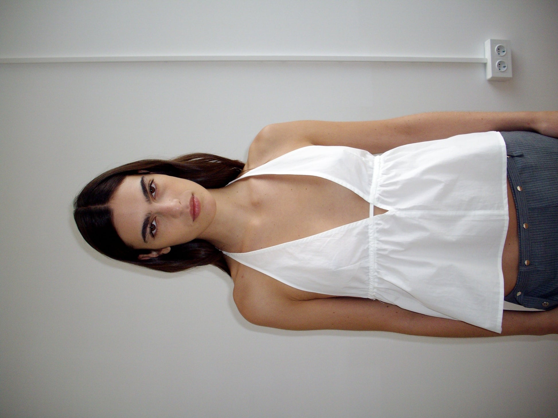 relaxed halter top features flattering v neckline, exposed drawcord front, adjustable backline with drawcord tie closure and silver button detail on split back
