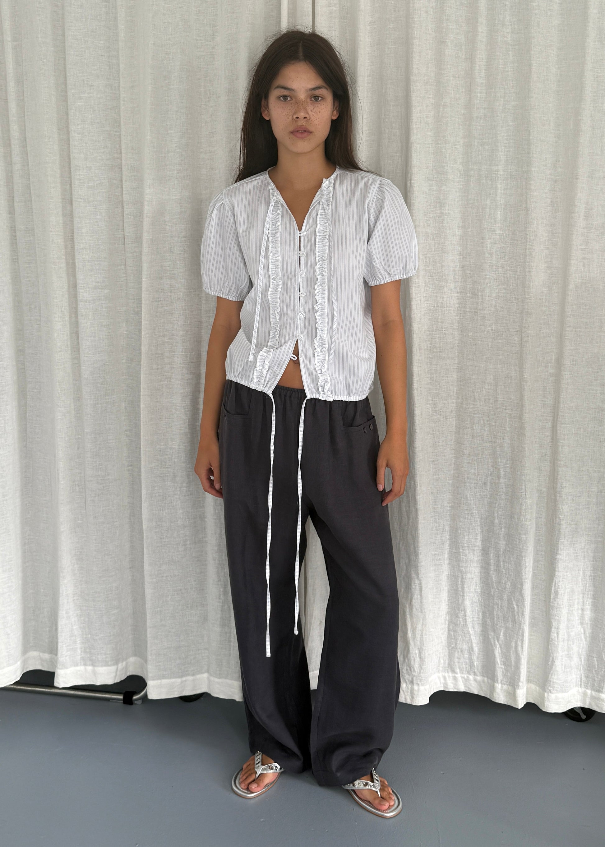 the double frill top by Deiji Studios in sage stripe