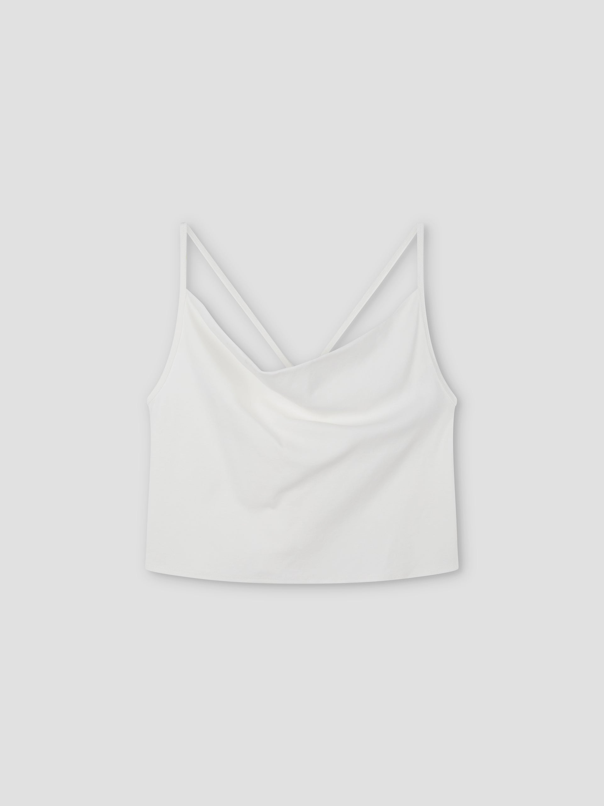 a lightweight top designed with a soft draped neckline. features crossover straps and tie up detail at the back
