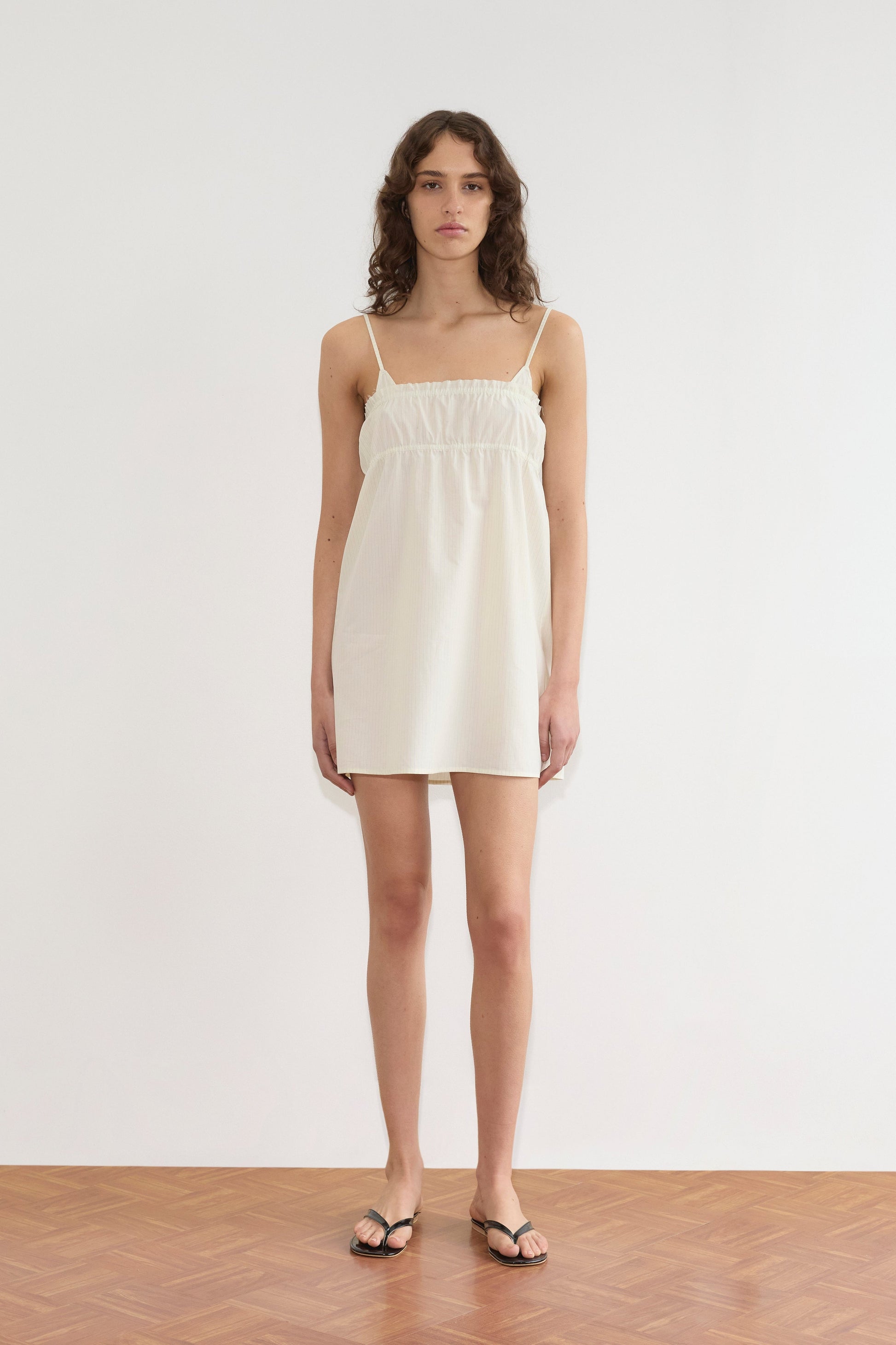 a lightweight dress with a relaxed silhouette. designed with fine shoulder straps and soft gathering through the neckline. finished with a subtle raw edge detail