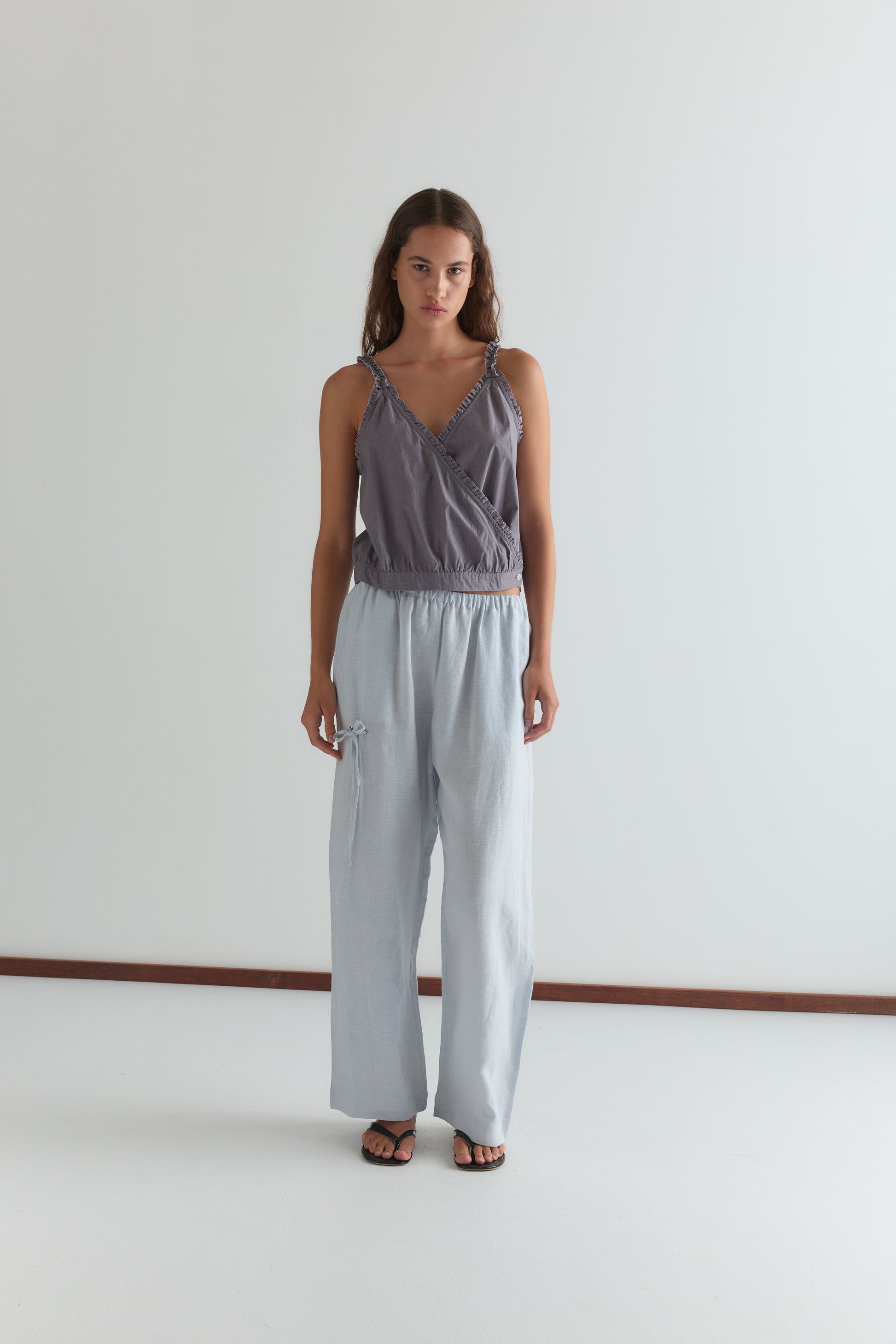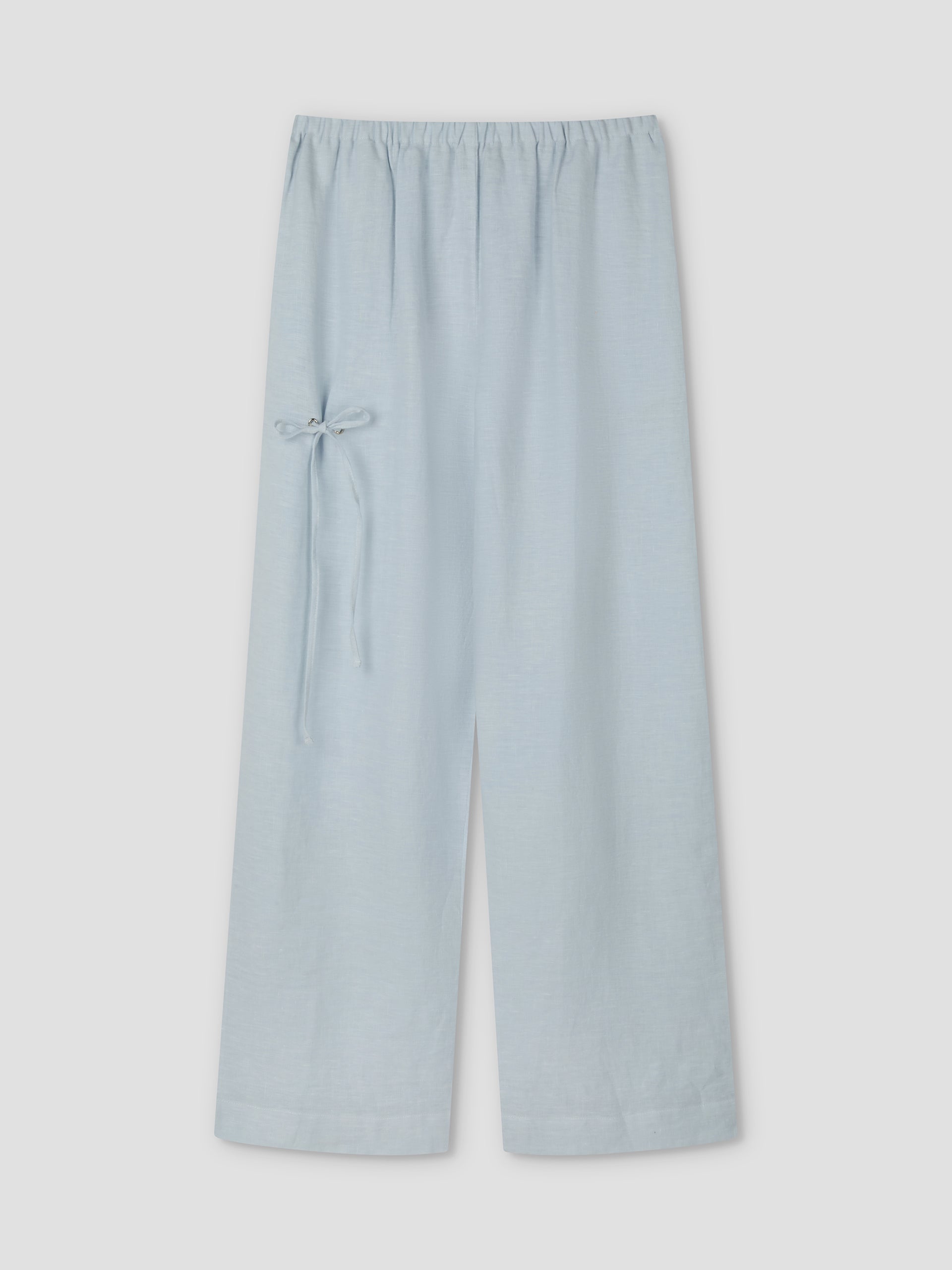 a relaxed low to mid rise, ankle length pant features a soft minimal elastic waist, side seam pockets with eyelet and tie detail in a straight leg
