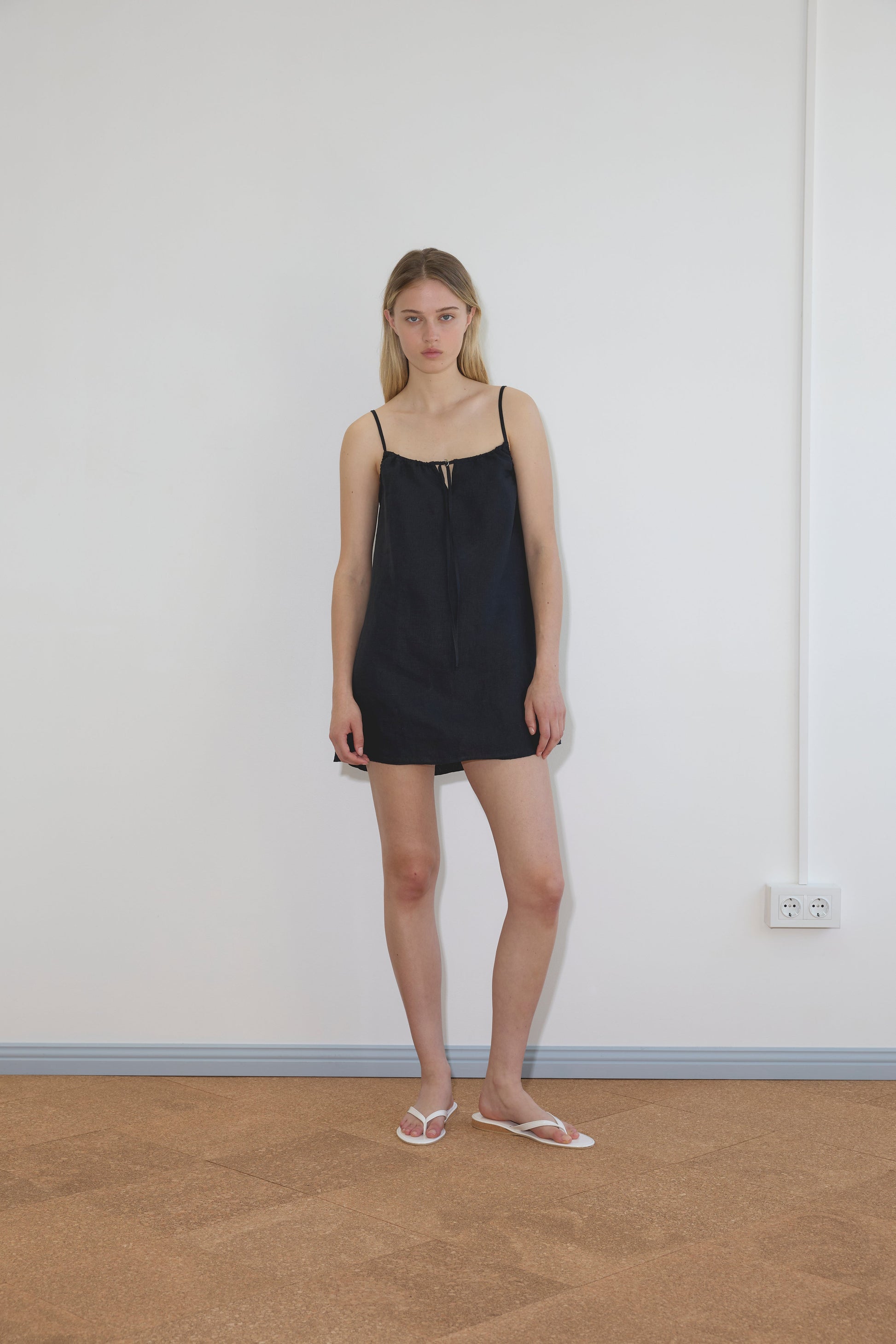 a short-length dress featuring a drawstring front with ring closure detail and adjustable fine straps in a relaxed fit