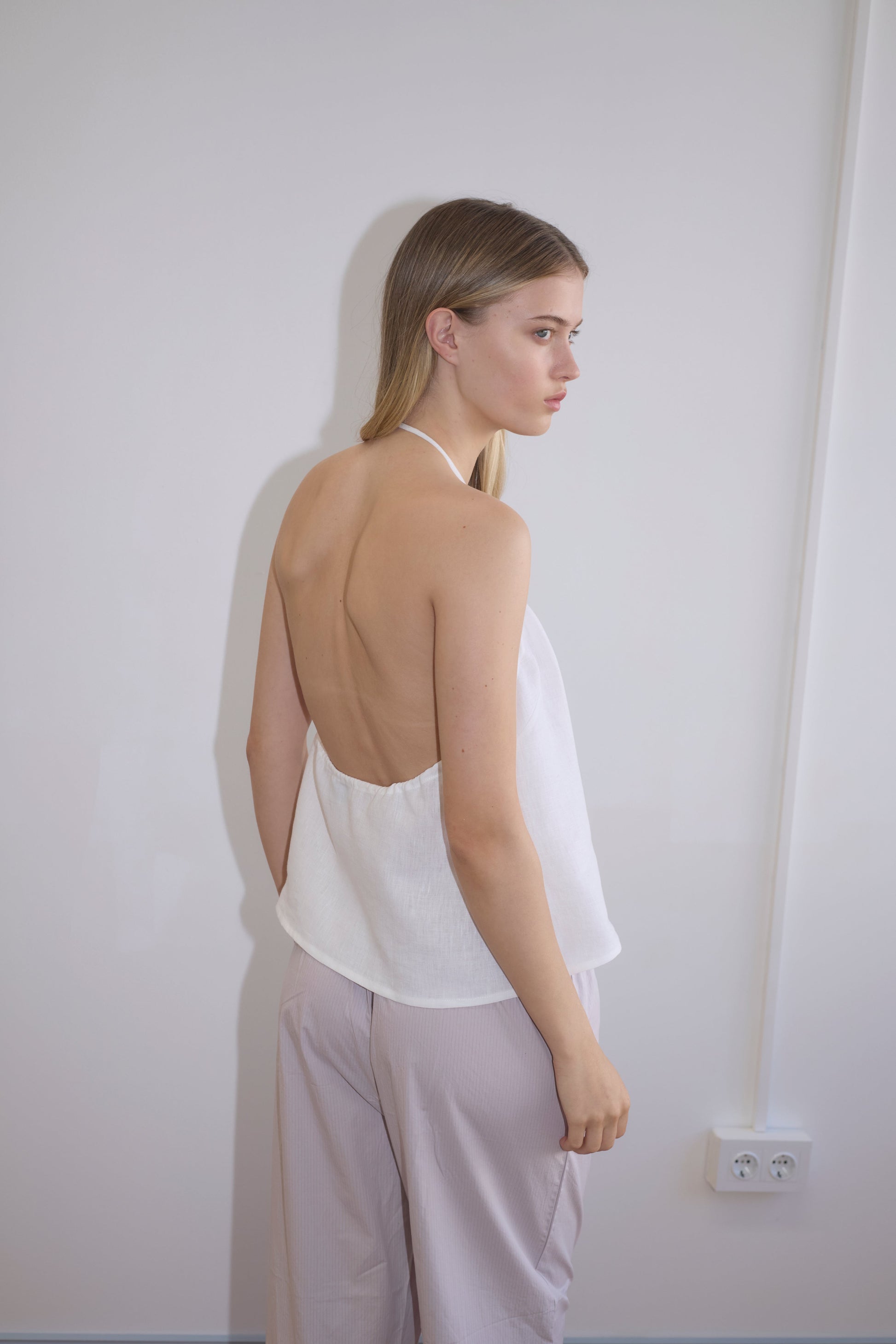 relaxed halter top features flattering curved neckline with adjustable o ring fine halter straps.