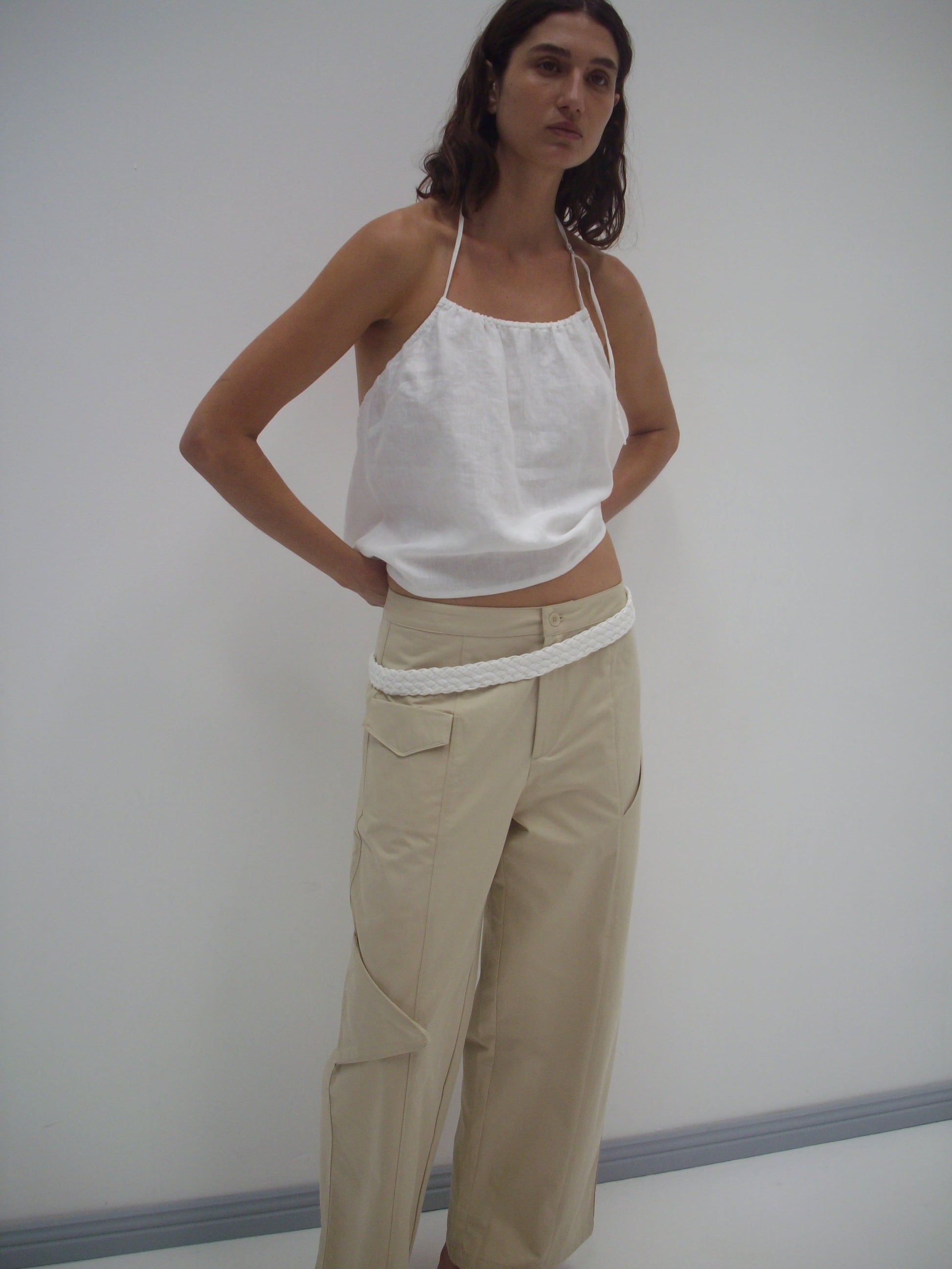 a straight leg, full length trouser designed to sit mid-rise, features a cargo pocket at hip, triangle design tab at knee, button fly, and back double welt pockets that are traditionally constructed to sit flat or be opened at the wearer's discretion