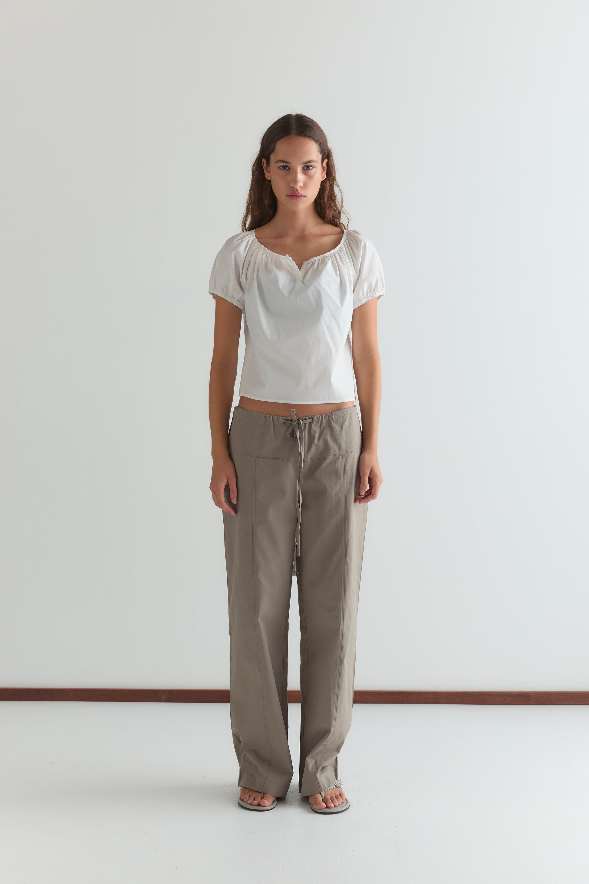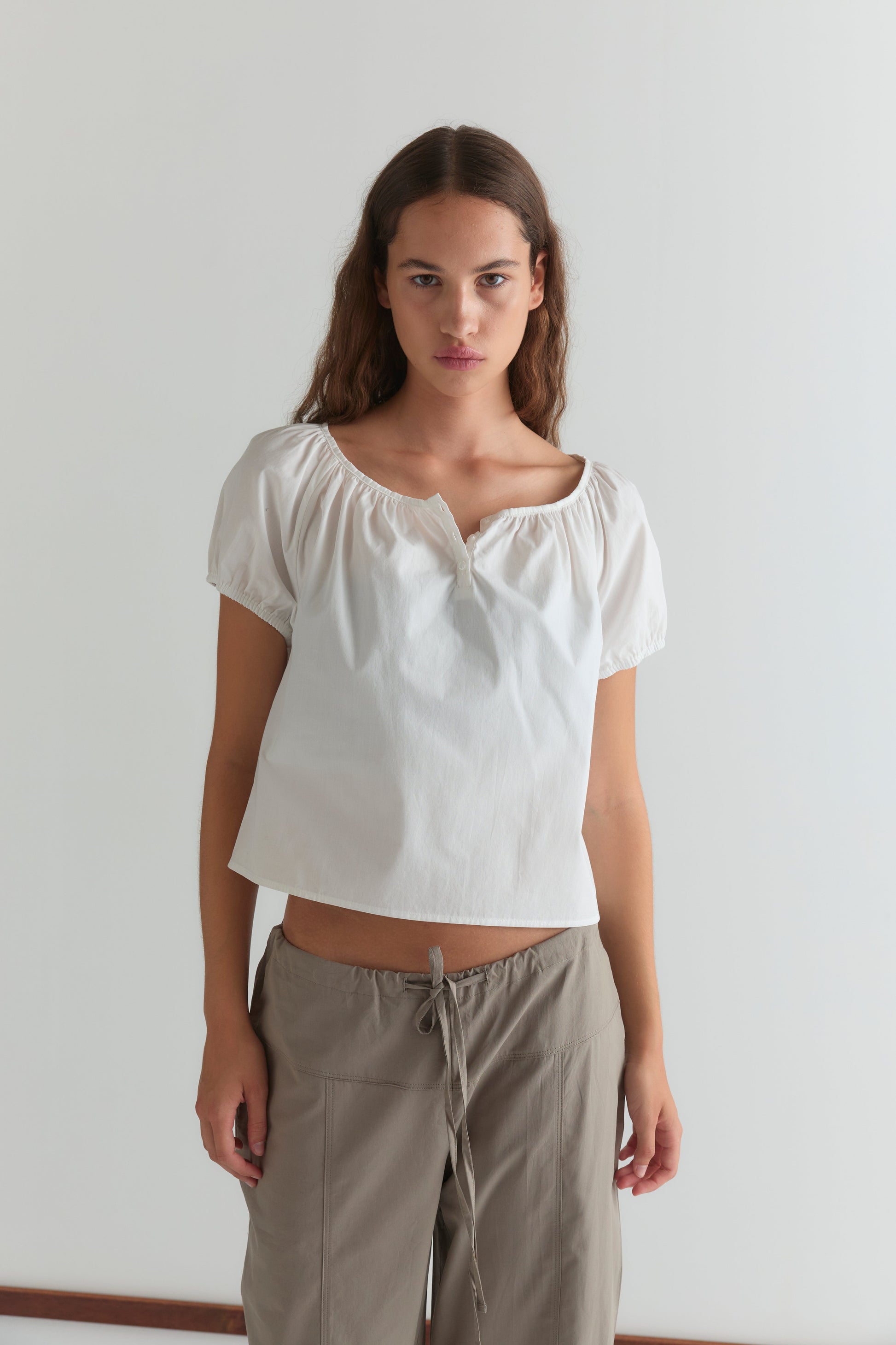 a softly structured short sleeve shirt featuring a rounded neckline with a button opening at centre front. designed with gently puffed sleeves, elasticated cuffs and a cropped, relaxed silhouette with a straight hem