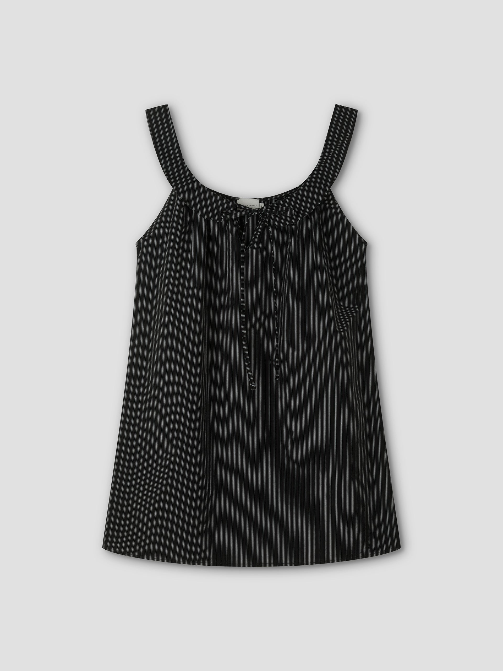 a lightweight sleeveless style dress with a softly structured and relaxed fit. designed with a rounded collar and tie up centre front