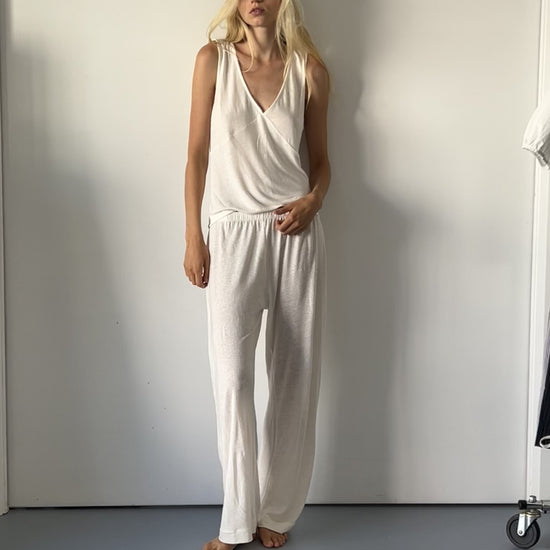 in an updated durable fabrication, a full-length easy pull-on pant designed to sit mid-rise, features a relaxed straight leg with a soft elasticated waist for extra comfort. pair yours back with the soft tank or soft t-shirt for an elevated loungewear look or on its own with your favourite t-shirt or knit.