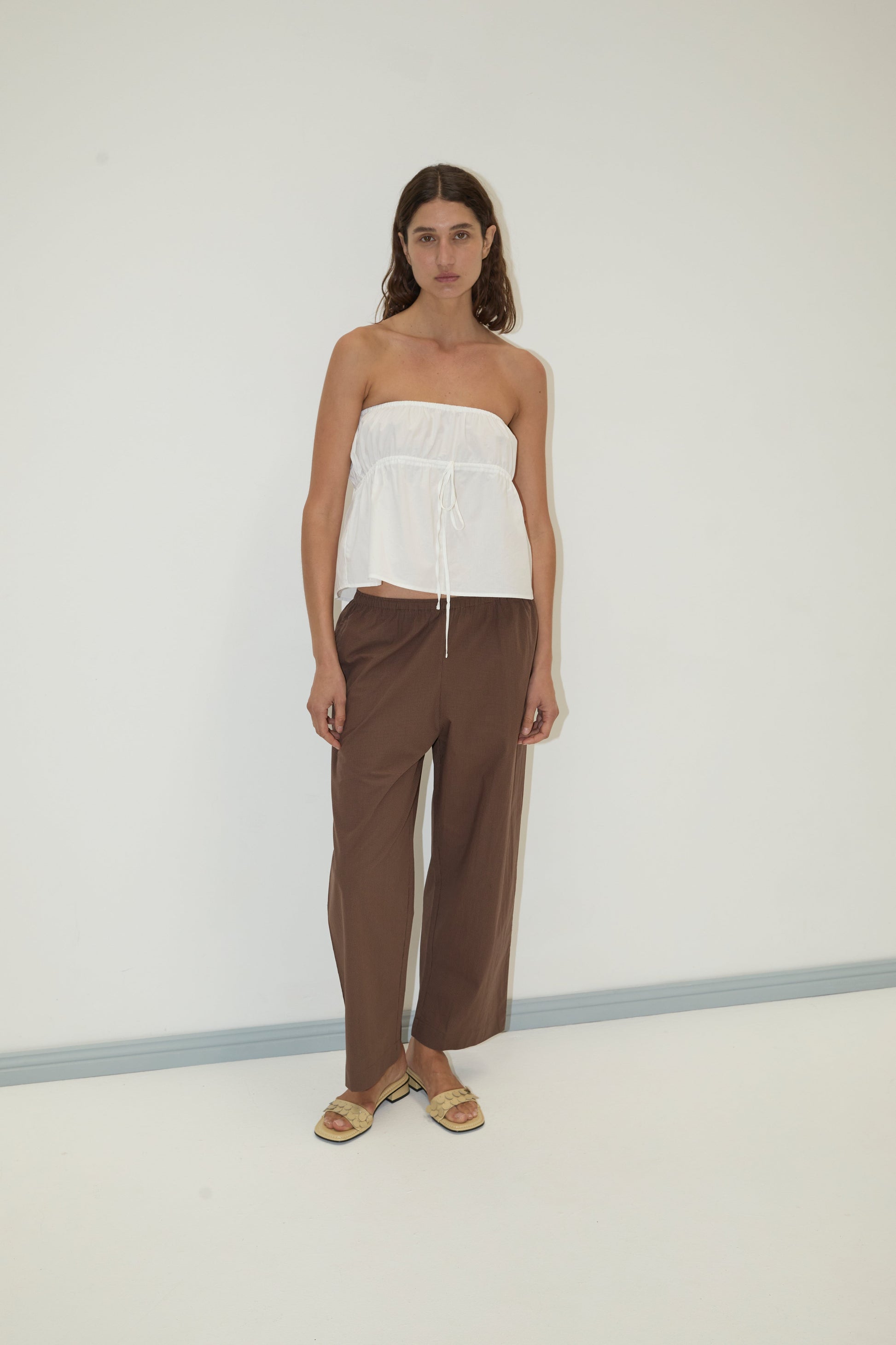 a double gathered elastic bust for soft shaping in a strapless style top, featuring a functional centre bow and mid-length