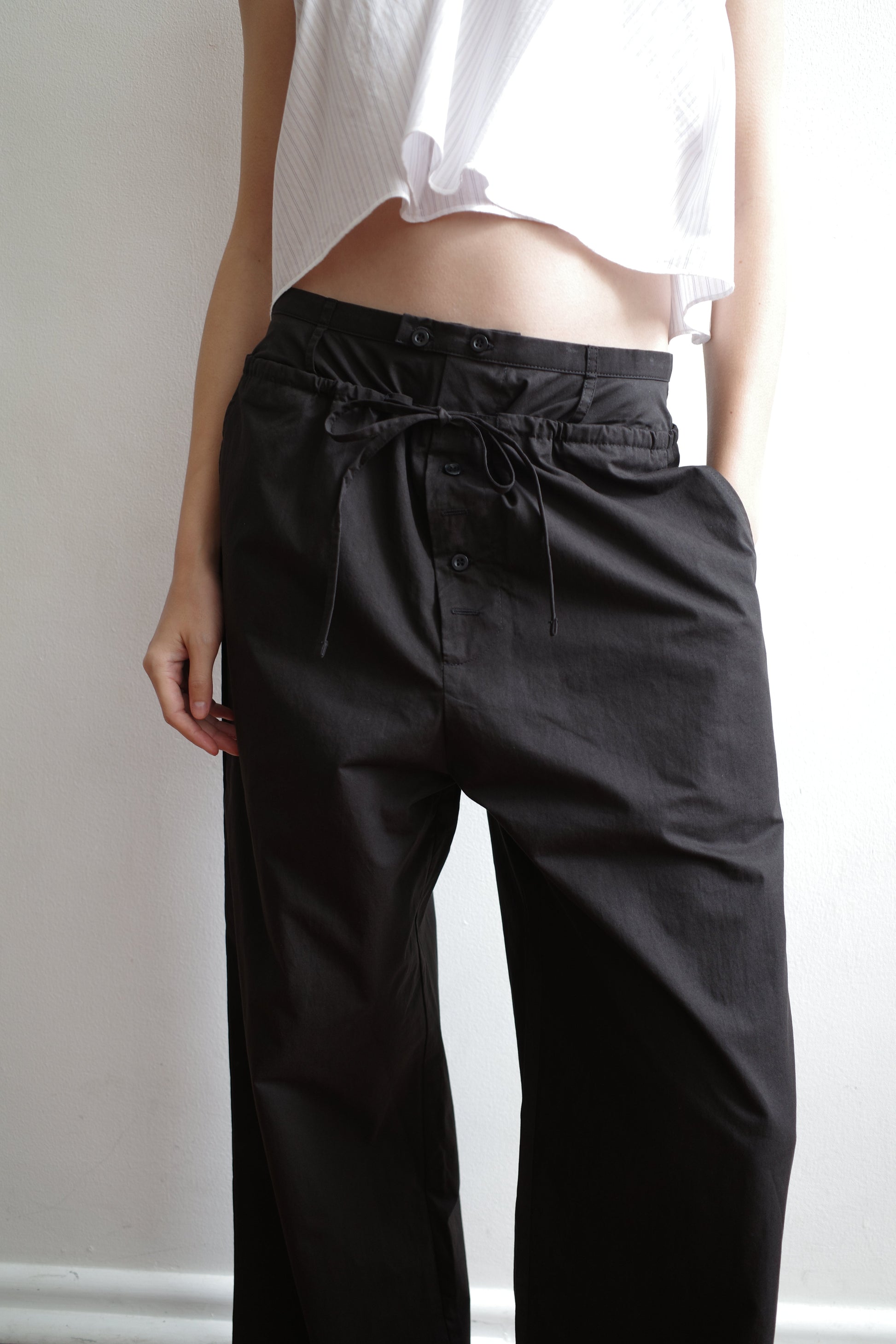 a relaxed straight leg trouser pant designed to sit mid rise, features deep side pockets, functional button placket, two waistbands with button closure and adjustable front tie.