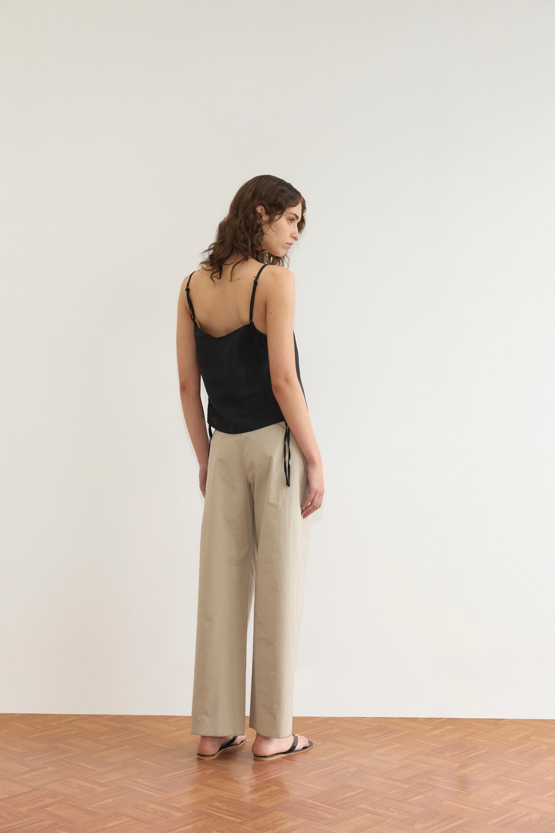 the v neck cami by Deiji Studios in blacka lightweight cami featuring a soft v neckline at the front with a subtle keyhole detail and fine button closure. designed with slim straps and adjustable drawcord channels through the armholes with a functional tie underarm