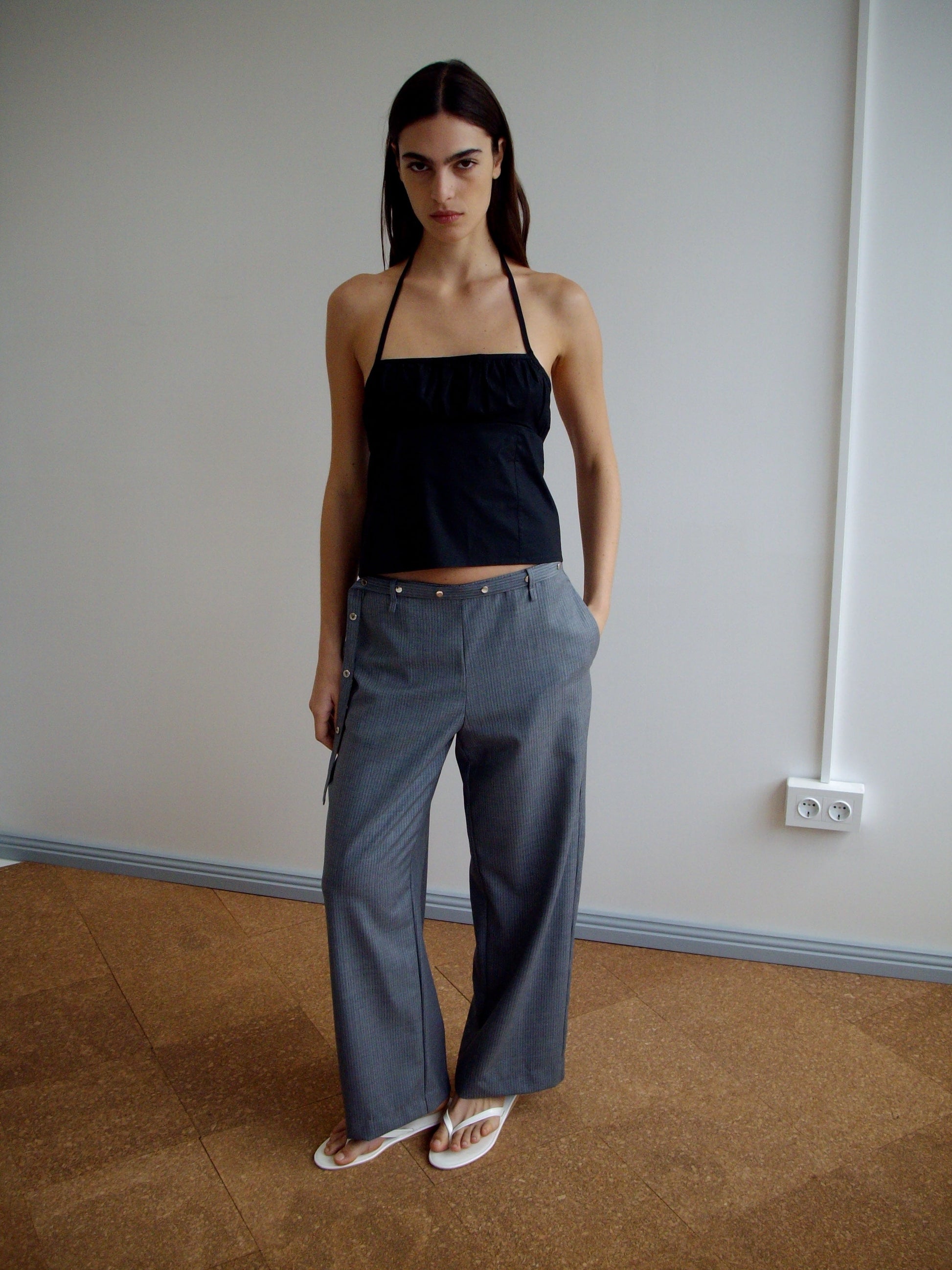 the wool belt pant by Deiji Studios in grey blue stripe