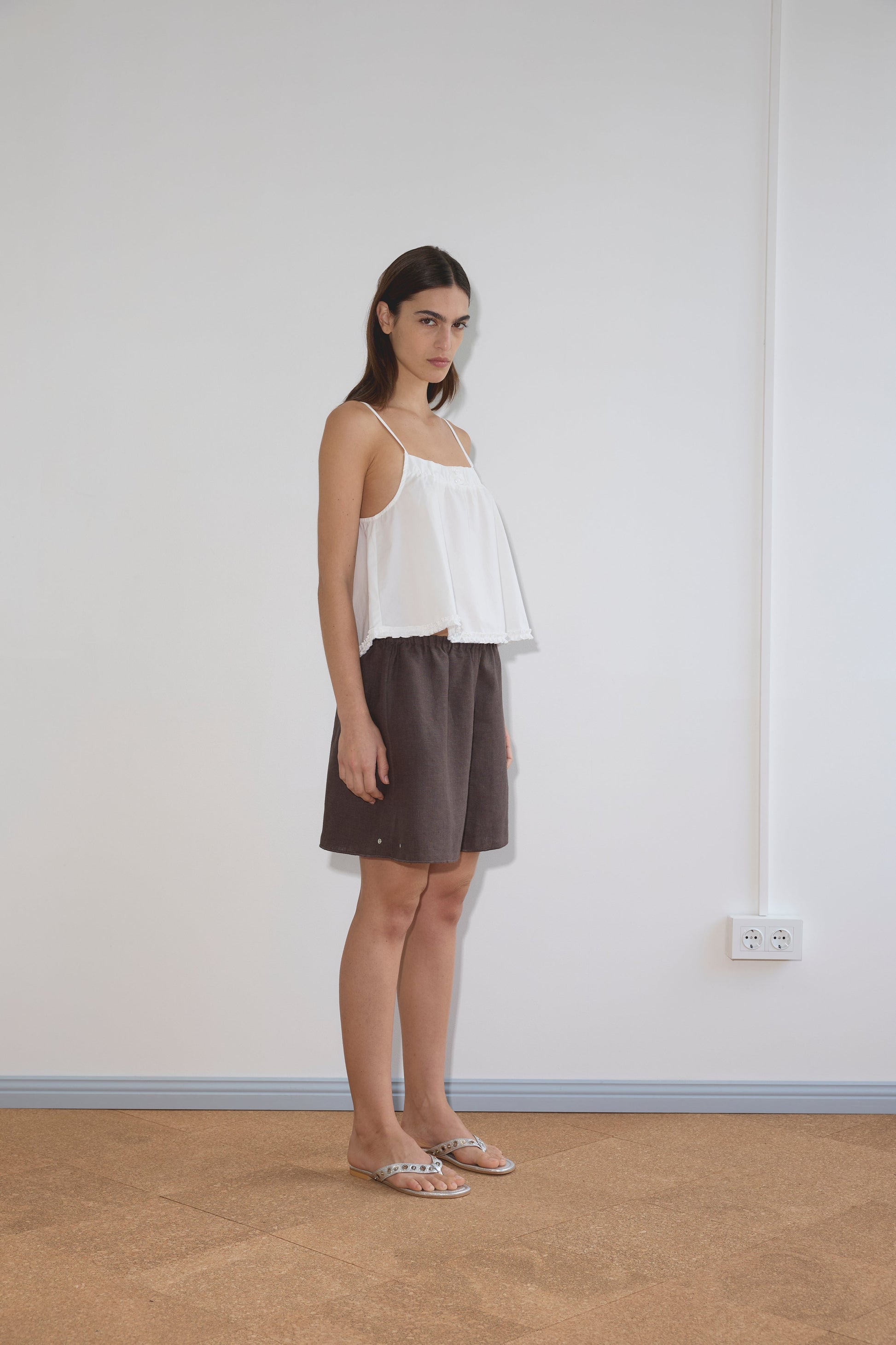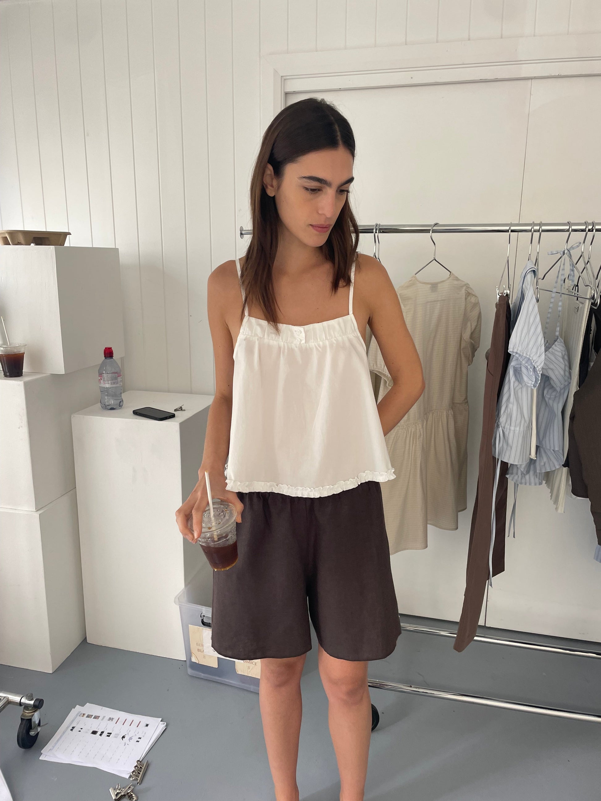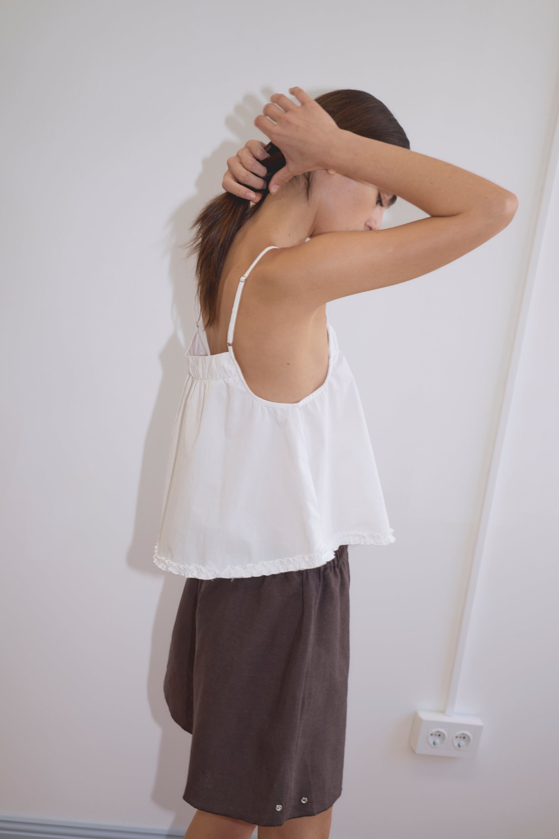 relaxed babydoll top featuring flattering straight neckline with button closure, gathered yoke seam, lettuce frill detail on bottom hem and fine straps